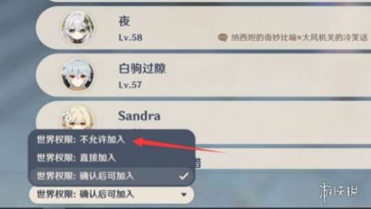 3、在屏幕左下角点击“世界权限”选项,然后选择“世界权限-不允许加入”。