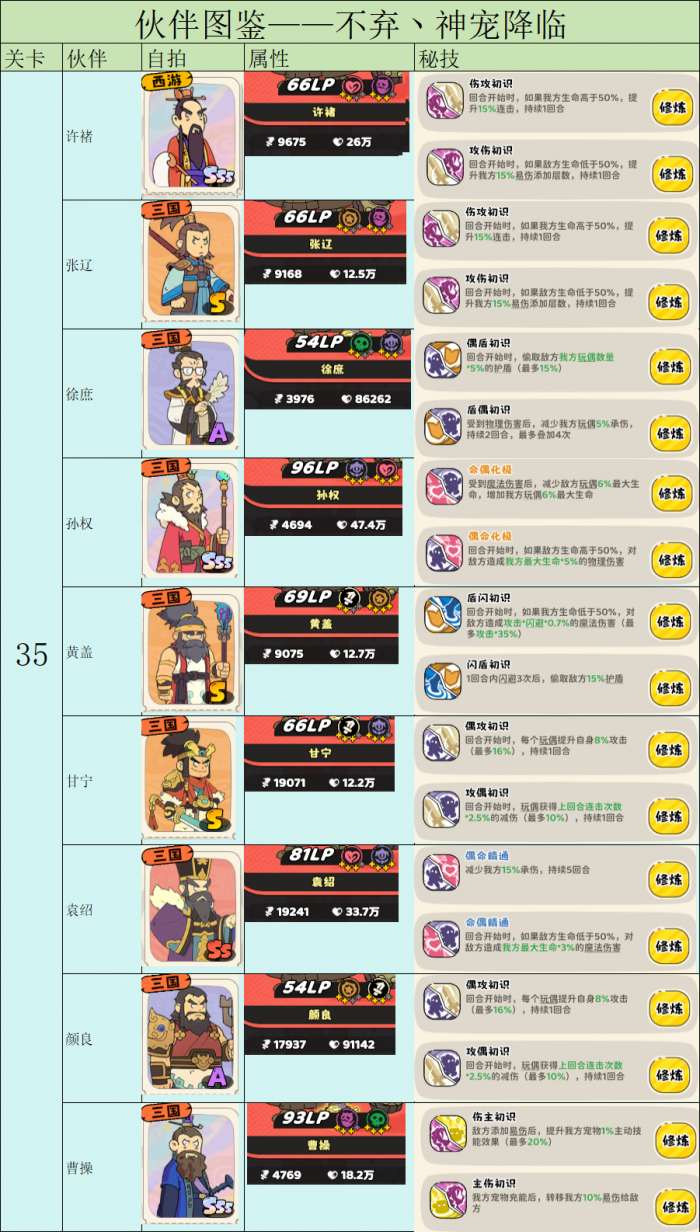 在冒险前50关与伙伴交流(战斗)后可以解锁伙伴,一些固定的伙伴会解锁对应的密友,密友的额外属性加成达到了100%,在前期的提升是非常大的。有些伙伴需要前置条件,我这里也总结了72个伙伴的对应关卡、前置条件、战力及对应的秘技,数据都是内测的,公测如修改会及时更新。有些伙伴的战力很高,初见很可能打不过,可以等属性高一些再回头解锁即可,不容易坐牢。难打的伙伴可以针对他的流派来点出克制类技能再打,会简单不少,点名菩提祖师,闪避枷锁点满再打。