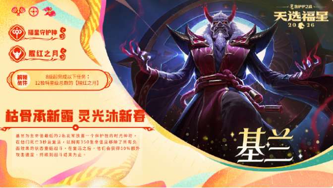 在2026福星守护神活动中,基兰的解锁条件是:在8级或以上时,场上【腥红之月】弈子的独特星级总数达到12。作为福星守护神/腥红之月单位,其技能可为生命值最低的2名友军放置时光神符,使其死亡3秒后复活,并移除所有负面效果,复活后永久获得50%额外攻速。
