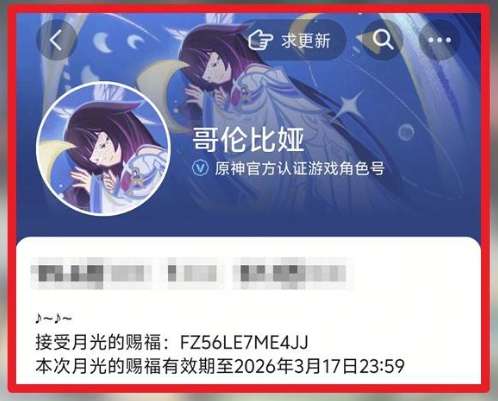 原神哥伦比娅月光的赐福兑换码现已公布:FZ56LE7ME4JJ,有效期至2026年3月17日,玩家只需在有效期内使用,就能获得对应的奖励,还没有领取的玩家们赶快去领取吧。