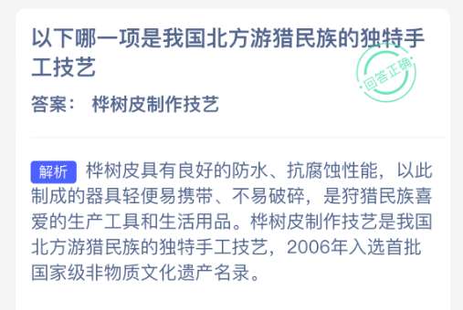 以下哪一项是我国北方游猎民族的独特手工技艺?【蚂蚁新村每日一题】2026年2月9日题目已发布!坚持答题,积累木兰币,即可加速小镇建设。答对本题,立即可享“产速+3/时”的加速奖励!今天正确答案是【桦树皮制作技艺】。桦树皮制作技艺是我国北方游猎民族的独特手工技艺。