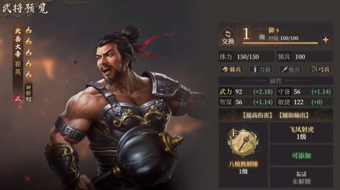 自带术法提升下一个术法造成的伤害,效果看脸且只对单个术法生效,比较鸡肋。不过崔英的传道术法四气调神很有意思,叠满层数后增益相当可观,建议抽个放盾兵阵容里。比较亮眼的地方在于灵宝【八棱熟铜锤】,满级最多对4个目标造成一次250%的伤害,显然也是为后期攻城战而生。无论是绕后突袭敌方弓兵,还是远程狙击敌方骑兵枪兵,杀伤力都很不错。