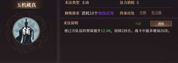 玉机藏真,方弼、杜元铣传道获得。又一个叠叠乐术法,满级最高可叠20层,提升全队240点智谋。跟前文说的类似,哪怕没叠满也很香了。