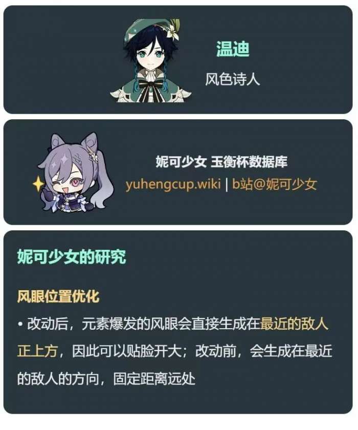 简单来说就是风眼位置的优化,改动后元素爆发的风眼会直接生成在最近的敌人正上方,也就是说温迪可以贴脸开大,这么一来温迪最大的毒点倒是给优化了,毕竟之前十大九歪,是真的难受,说是传说级优化也不为过。