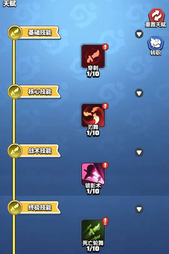 以选择“刺客”职业为例,当到1阶职业时,就能解锁对应的四种类型技能,分别是基础技能、核心技能、战术技能、终极技能。