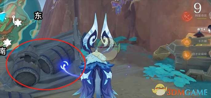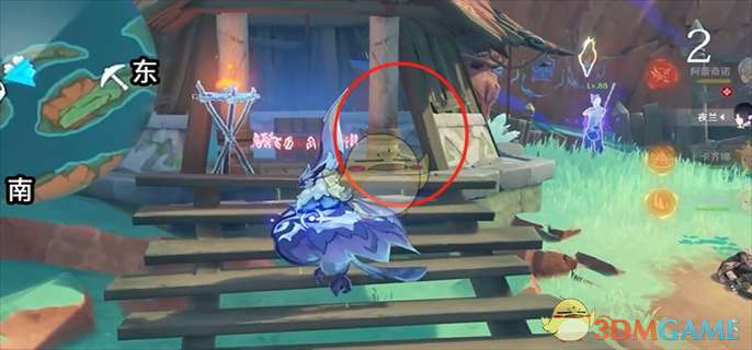 9、西方向,在如图位置寨子屋顶上方有一个神瞳,寨子门口把怪打了可以获得宝箱;