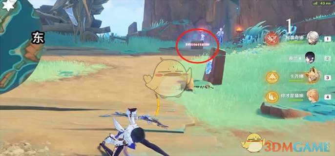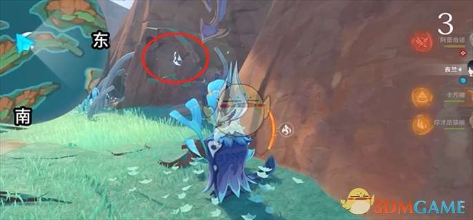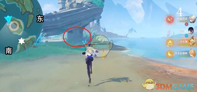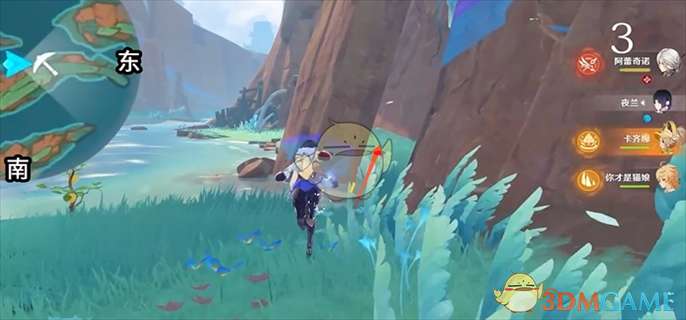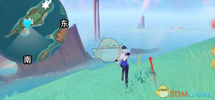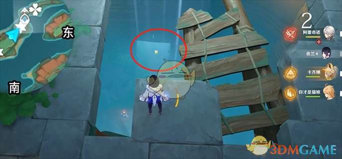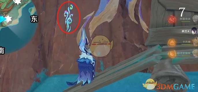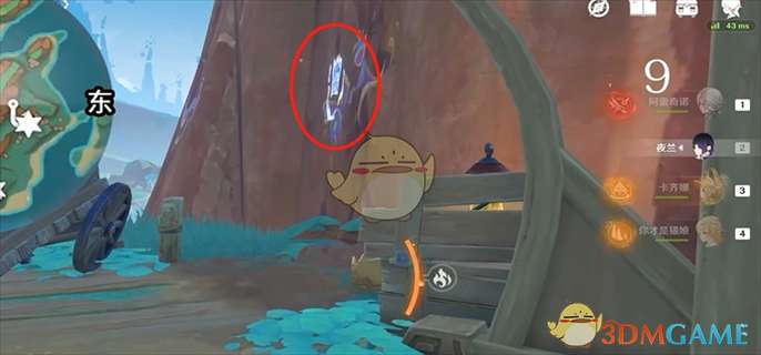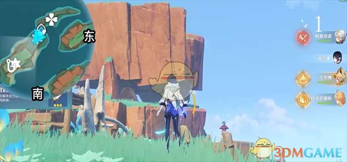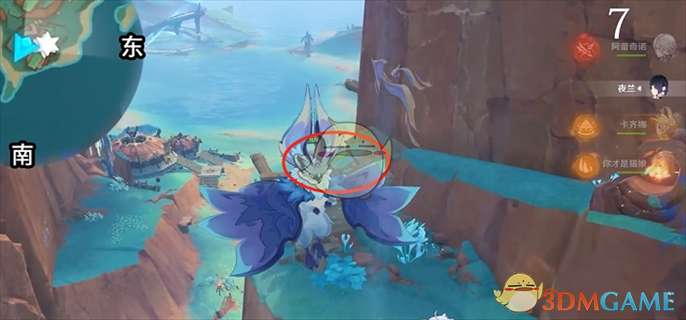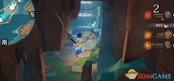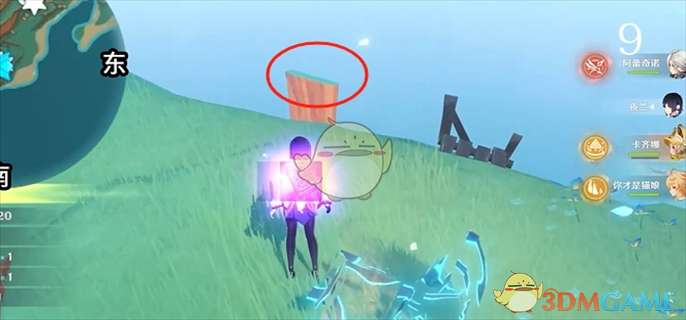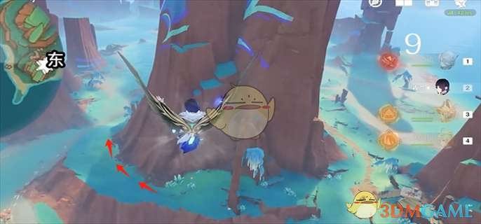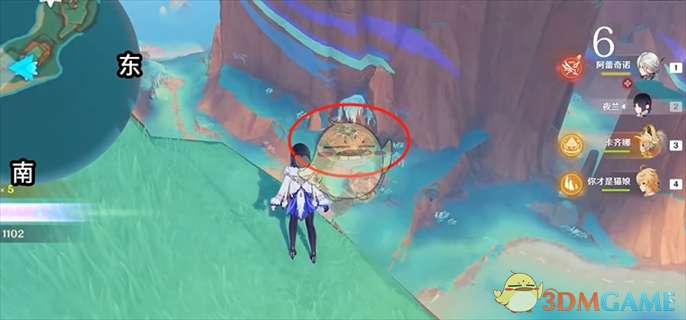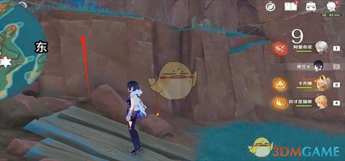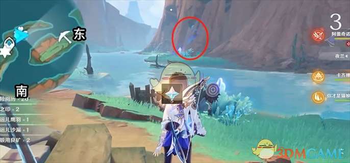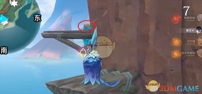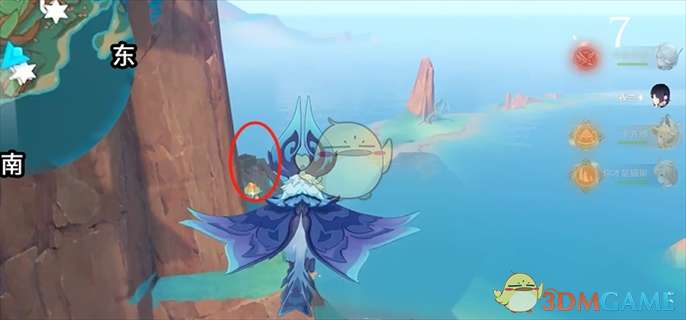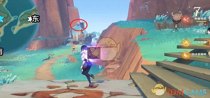 3、小地图西南方向,需要到达山顶上面,可以从左前方的石柱上去,到达山顶后,可以看到正前方有个神瞳(可以拿出岩主垫下脚);