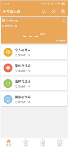 中考政治通app怎么用,用户进入软件之后就可以找到各种知识点,我们点击发现还能够看到专题和学习技巧,最为主要的是可以在这里找到各地最新的中考真题试卷和模拟卷。