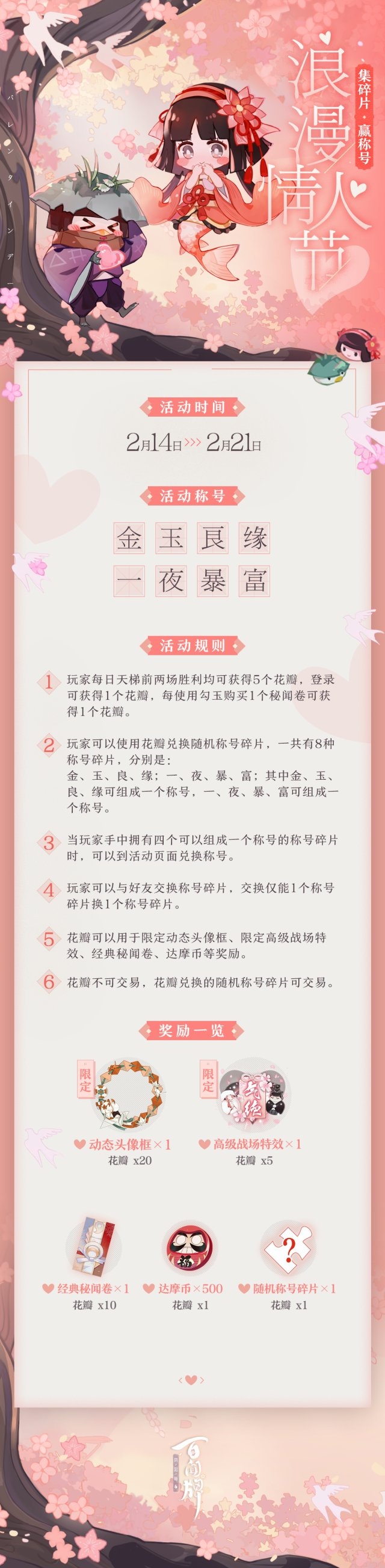 2020年的情人节已经临近了,而一向必然到来的活动自然也如期而至。本次网易妖怪卡牌对战手游《阴阳师:百闻牌》,即将开启情人节活动!2月14日至2月21日,在活动期间登录游戏或完成相应任务均可获得花瓣,花瓣可兑换情人节限定好礼和随机字牌碎片。集碎片得称号,更有限定动态头像框、限定高级战场特效、经典秘闻卷、达摩币等奖励等你来拿!