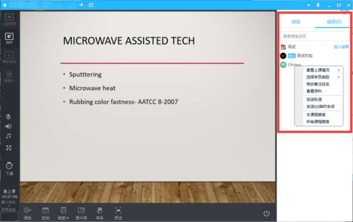 1、老师在界面右侧成员区用鼠标右键单击某个学员。