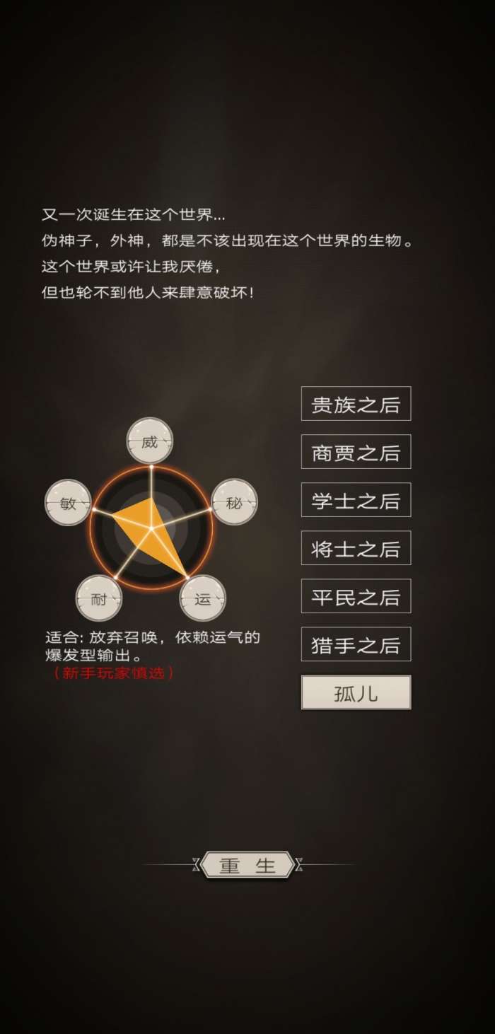 孤儿官方唯一给了红色标注的大神级别职业。是无数高玩大佬的心中神!但事实上特么的萌新还不如去玩平民。一样的高运还高耐。但这职业就如LOL的亚索PUBG的AWM一样。是信仰型职业。虽然高运带来的收益其实并不好,但是大神不在乎,我们在乎的只是这个名字,还有下面的红色标注!怎么听起来这么骚气?但事实上真的如此。孤儿的属性真的不友好,新人杀手就算老玩家也会头疼。高运带来的的几点暴击率和格挡,随便一个词条都要比它优秀。