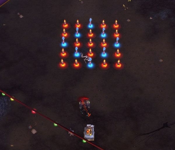 《军团再临》版本萨满职业大厅的小游戏,地上会出现一个5×5的图腾阵,图腾分为蓝色与橙色两种。点击任意一个图腾都会使其和与其相邻的图腾颜色变换,获胜目标是将所有图腾变为蓝色。
