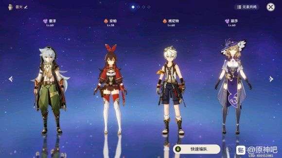 通关阵容是这样,在第五层以后我们必须要有两套队伍。雷泽+班尼特主C,安伯和丽莎辅助。双火双电组队有加成