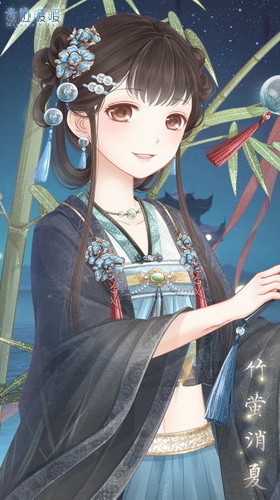 【竹萤消夏】含正常姿势与特殊姿势,并含特殊姿势外套“竹萤消夏”,精美可移动摆件“月竹微风”,海报展示妆容为“暖暖的微笑”,可通过服装店购买获得。