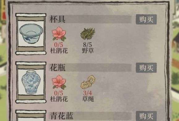 三、店内商品:杯具:杜鹃花*5,野草*5;花瓶:杜鹃花*5,草绳*4;青花蓝:花瓶*1,草绳*7。