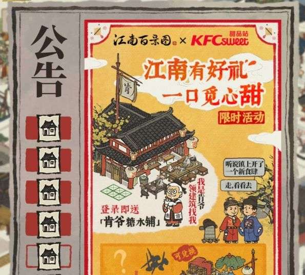 江南百景图肯德基活动将要在2月10日开启哦,登录即可获得肯爷糖水铺哦,同时还有多种兑换奖励等着大家呢,而且我们的肯爷会随处转悠哦,找到他可兑换相关奖励呢,具体奖励内容现在就来告诉给大家吧~