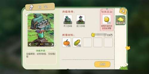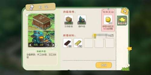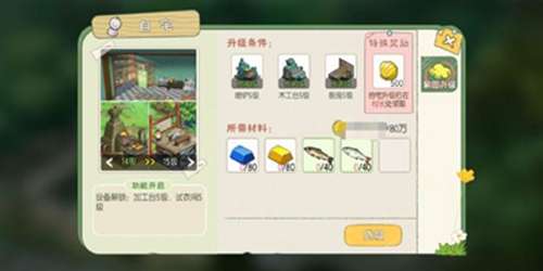 【升级条件】加工台2级(蓝莓x35 柠檬x35 柿子x35 金币18500)、制衣间2级(拓木板x35 西兰花x35 白菜x35 金币18500)