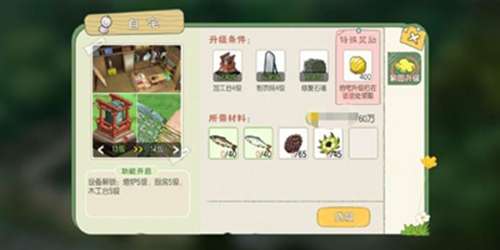 【升级条件】制衣间6级(冷尾木板x100 松纹木板x100 金币900000)、引虫箱2级(魔芋豆腐x25 茄汁沙丁鱼x25 金币850000)