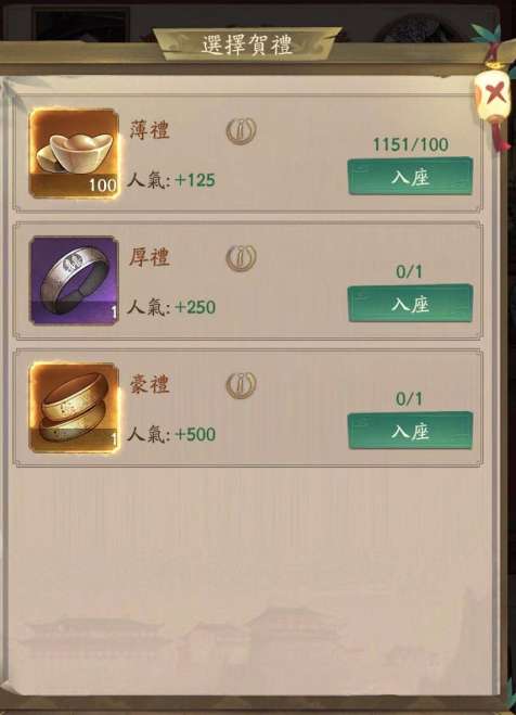 7.赴宴需要携带礼物,礼物能够增加人气,选择了礼物后就可以点击入座参加宴会了。