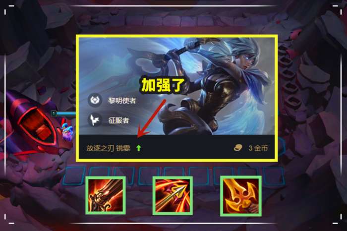 可以看到,这个锐雯的装备是两个黑暗飓风和一把杀人剑,其实这样也不是不行,只不过并不算是最佳的装备。