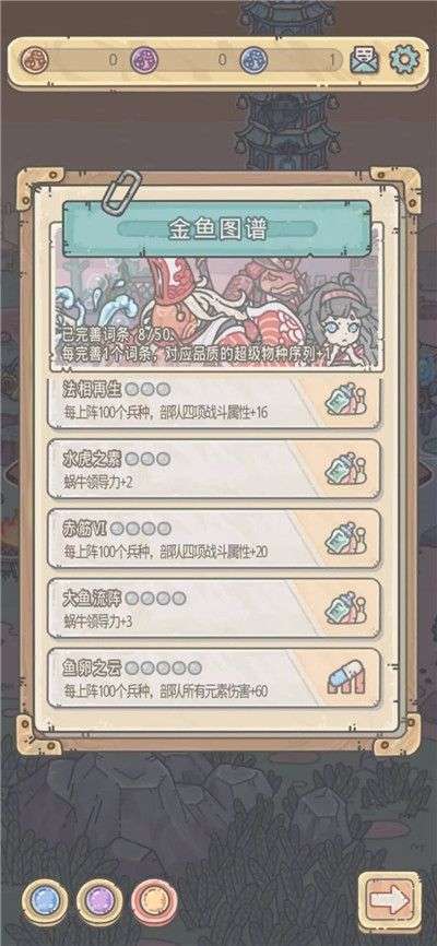 增强兵种属性(文本描述中没写金鱼族战斗中,应该是永久生效),降低金鱼族物种战战损,增加领导力。