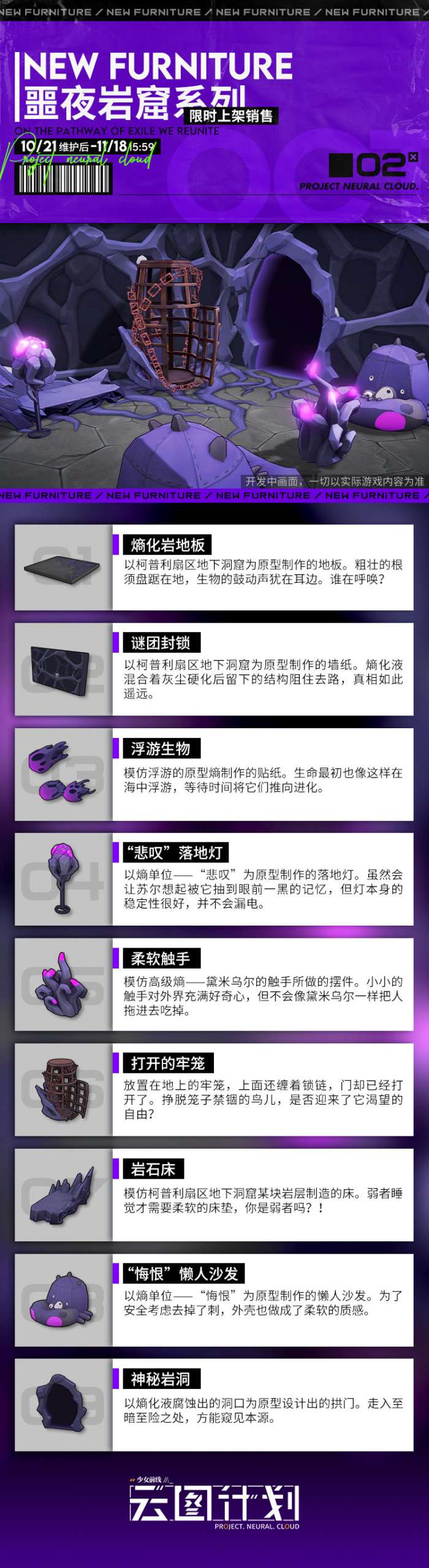 亲爱的教授,主题家具“碧海假日”系列&“噩夜岩窟”系列即将于10月21日维护后实装!其中“碧海假日”系列家具可以通过参与「神导异论」活动获取,而“噩梦岩窟”系列将会限时上架家具商城,您可在商城内用家具币购买该套家具。在绿洲内,即使蜗居在家也能感受到夏日海滩的热情!还有在海滩下潜藏的未知......