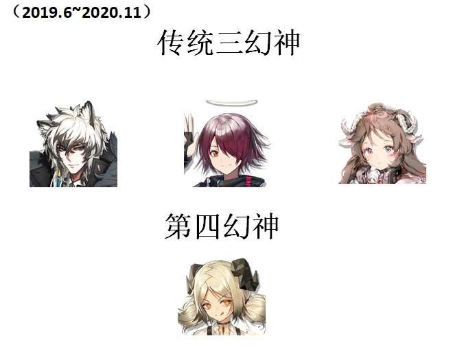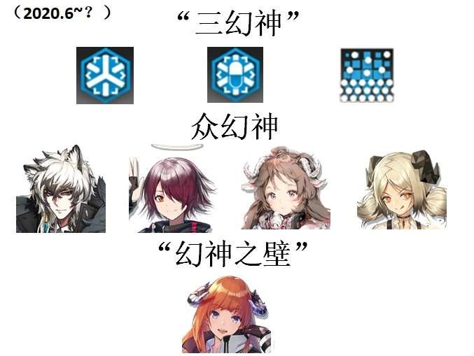 三幻神:三幻神一般指能银羊(能天使、银灰、艾雅法拉),代表的是三位开服输出天花板干员。此外也有将泛用型不足的能天使替换为高难强力的奶盾塞雷娅的说法。