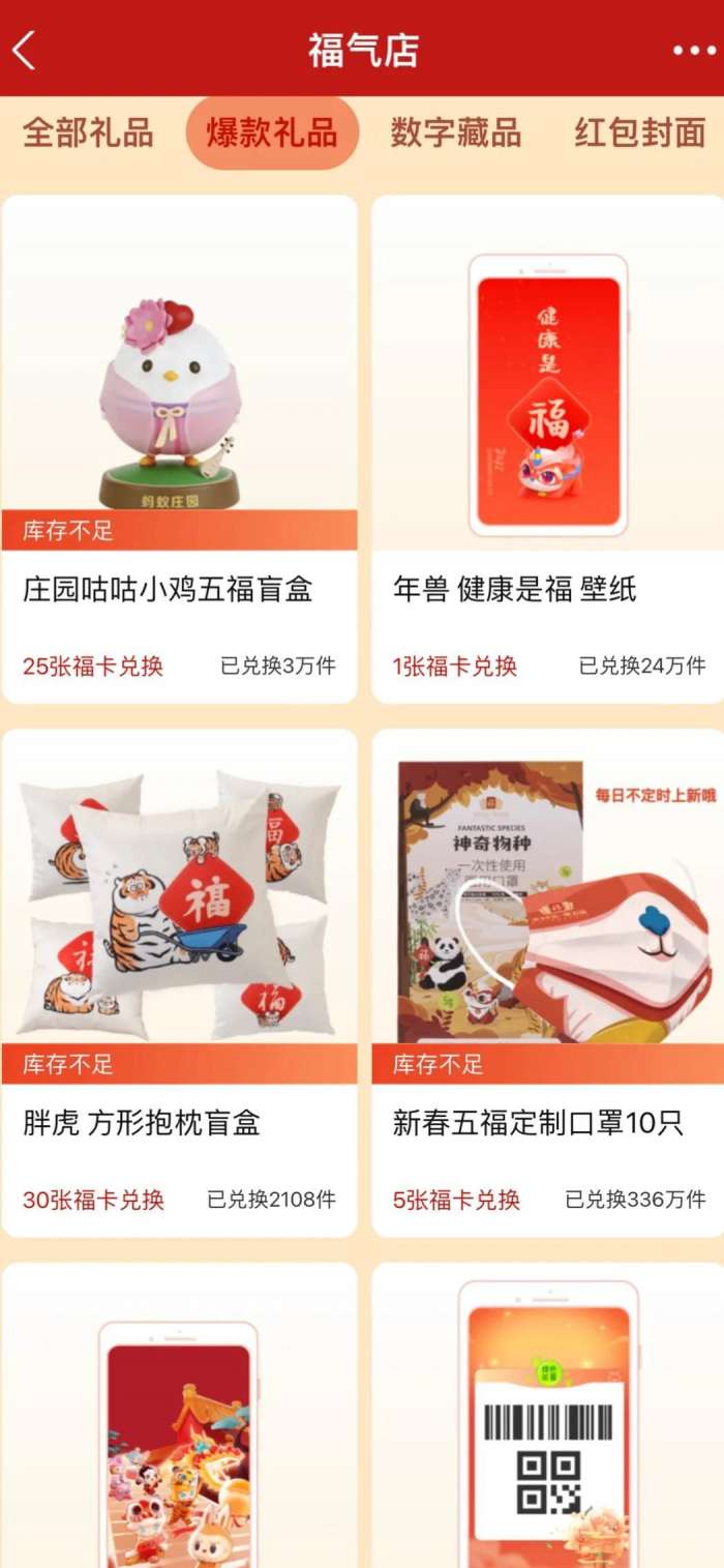 最后,在“福气店”里,我们可以用攒下来的福卡,兑换很多实用的东西,有红包封面,庄园盲盒,抱枕,皮肤,壁纸等,其中最良心,最值得兑换的是,用5张福卡换10个定制口罩,还有30张福卡兑换胖虎地垫,这两个每天都会补库存,手慢无。