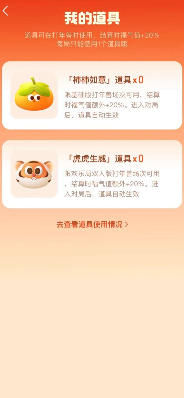 每天总共有9次打年兽的机会,一定要用完!我们先不要打,先进入“我的福卡”,—“福气店”—“一张富强福抽奖”,如果你抽到了“柿柿如意”这个道具,请你放声大笑,因为你就是真正的欧皇,这个道具可以使一局打年兽游戏的福气值增加百分之二十。打年兽之前使用这个道具即可。