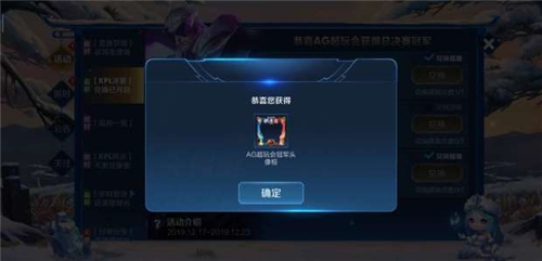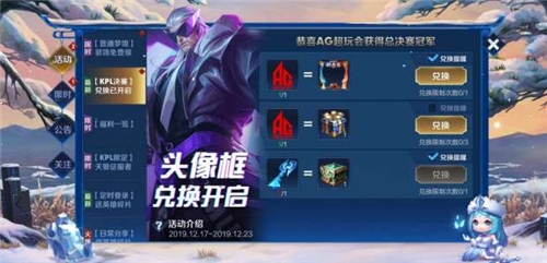 第四步:12月17日到12月23日期间,在游戏大厅点击【活动】进入【KPL决赛】兑换界面,就可以兑换第一个头像框奖励了,是不是非常简单呢?