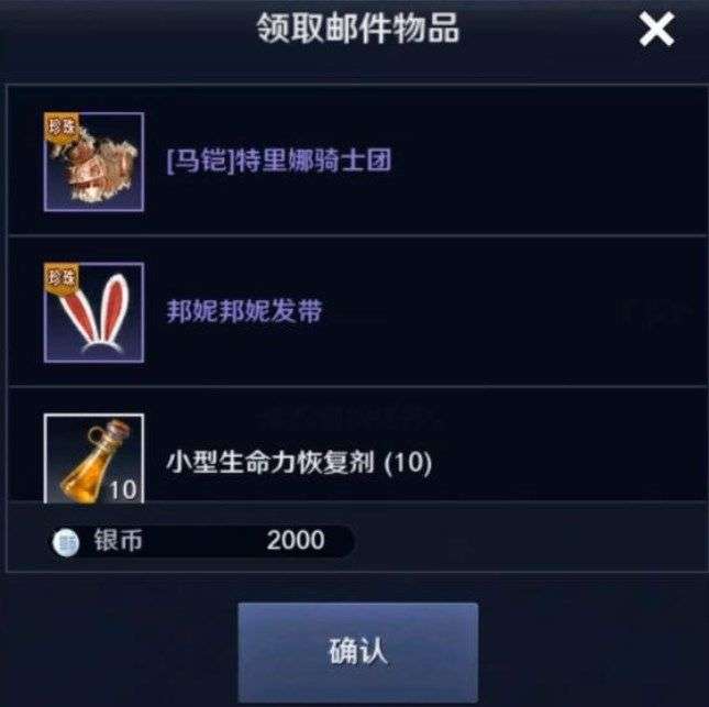 以上(5个)兑换内容:[马铠]特里娜骑土团*1,邦妮邦妮发带*1,银币*2000,小型生命力恢复剂*10
