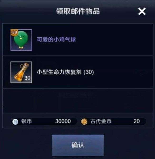 以上(5个)兑换内容:可爱的小鸡气球*1,古代金币*20,银币*30000,小型生命力恢复剂*30