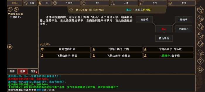 在控制主人物出门的时候一定要让其余弟子们在家里干活(压榨劳力),目前的任务是拜访镇长,准备好之后点左下方游历就能出门了,出远门记住带上粮食和疗伤的药品。 出门后按f可以打开大地图。