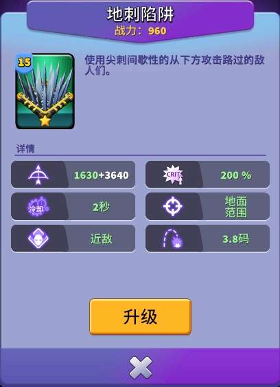 【地刺陷阱图鉴】地刺是专攻地面单位的高伤陷阱,能对经过的敌人造成1630点暴击伤害。其冷却时间仅2秒,凭借200%暴击伤害可瞬间重创敌群,是应对密集地面攻势的高效防御设施。
