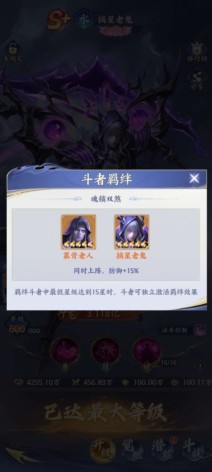 摘星老鬼核心的技能就是空间锁,可以针对敌方全体造成大概90%的伤害,另外还会有60%的概率给目标直接挂一层,持续两回合的空间锁。这一层debuff还是比较关键的,敌方在获取怒气时,就会有20%的概率让怒气减半,直接就会打乱对方开大招的节奏,从根源上就能限制对方的技能输出。而且他和慕骨老人之间还有羁绊效果,如果两个人可以同时上阵,就可以给整个队伍带来15%的防御,坦度就可以提升一个档次。