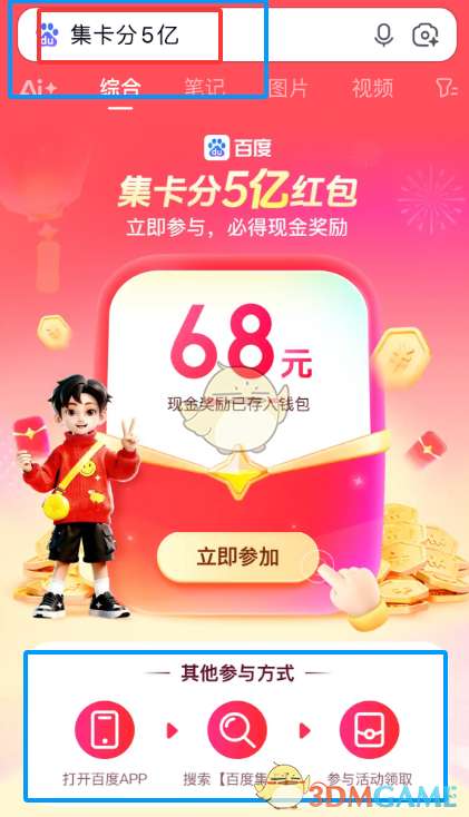 打开百度app,搜索【集卡分五亿】、【集卡分5亿】、【百度集卡】等关键词都能跳出下方图片,点击【立即参与】即可跳转到2026百度春节集卡活动主页面了!