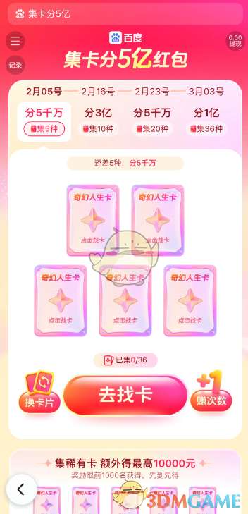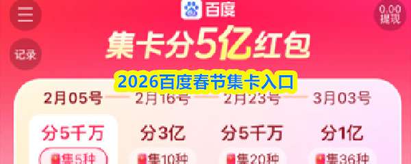 进入百度,搜索“春节红包”,进入其中后,可在【点我涨现金】右侧看到【集卡分5亿】,点击可进入2026百度春节集卡活动!