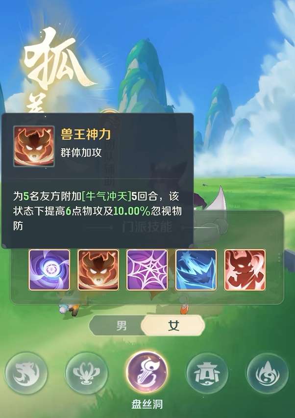 盘丝洞有着非常明确的职业定位,它所拥有的五个技能中,除了第一个技能可以打输出外,其它四个技能都以辅助队友为主。其中,二技能为加攻,三技能加防,四技能加速,五技能则能让选定的队友得到魔尊附体的效果,以获得命中提升和伤害提升的加成,是不折不扣的团队型辅助。