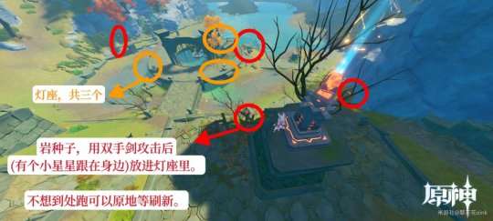把周围的岩种子带回三个灯座里就可以解锁机关。