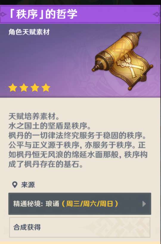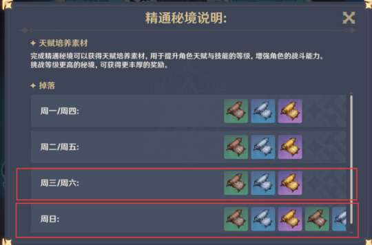 该秘境每日轮换挑战成功后可获得的天赋书类型,其中「秩序」系列天赋书素材仅在每周三/周六/周日可获得;仅在周日时,旅行者可自行选择获取的天赋书类型,请一定要看清并正确选择后再进行挑战。