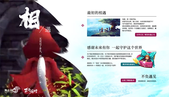 星星之火,可以燎原。《龙之谷》中的每个谷迷,用热爱守护着阿尔特里亚大陆,用努力和不服输的精神,在冒险的路上高歌猛进。为了感谢所有谷迷给《龙之谷》注入的爱与满满的能量,3月18日前登录十周年主题站,就可领取温暖感谢礼。强化之锤、保护药、潘多拉、坐骑礼包、变换药水等,千万不要错过哦。希望未来能继续与你们同行,在一起,守护这个不完美,却又无可替代的世界。