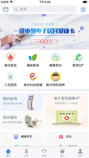 1、打开手机上的健康廊坊软件,进入软件后首先需要进行登录,初次登录的用户需要进行注册,点击验证码登录即可自动注册登录,登录后点击【首页】选项;