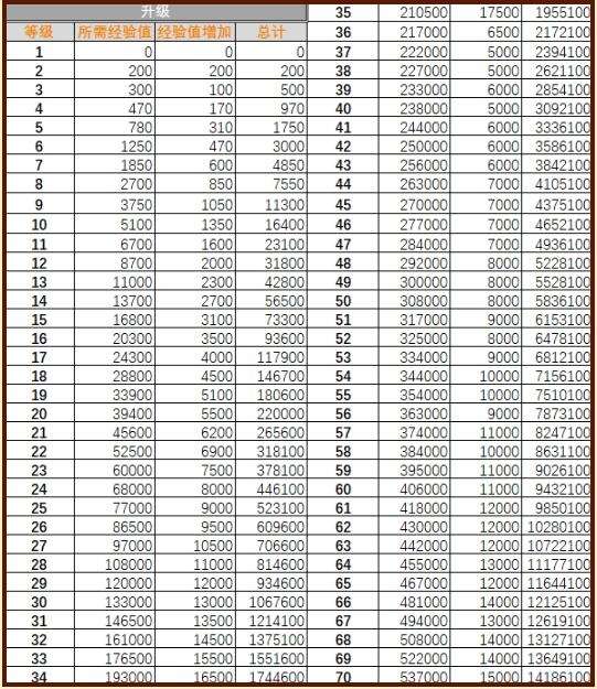 总计:指从零开始升至此等级的累计所需经验值。