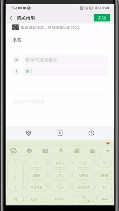 4、这时点击右上方弹出的进入接龙表格,点击左边的加号添加自己的名字后点击右上角的发送即可
