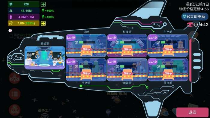 主舰一定要升级,别因为运输不够就只升货仓和运输仓(其实后面我的运输基本上都是空出来,原因上面提到过,我不屯那些货,所以不用再各个星系来回运输,基本只要运输市场的就行)。我觉得生产仓和科技仓是最重要的!生产仓决定了你在市场能不能做那些来钱快的商品,科技仓不够你任务不好做,材料也不好来。像我刚开始不升生活仓与住宿仓导致等级不够,后来花了好多钻石才跟上进度(为了满足我的强迫症)。