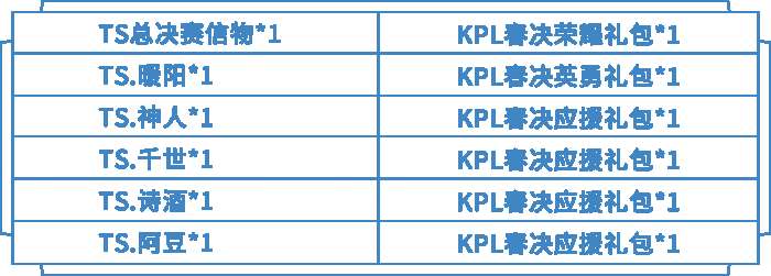 活动期间,冠军战队TS信物可兑换KPL荣耀宝箱,总决赛MVP选手TS.暖阳信物可兑换KPL英勇宝箱,其余的战队信物可兑换KPL助威宝箱。