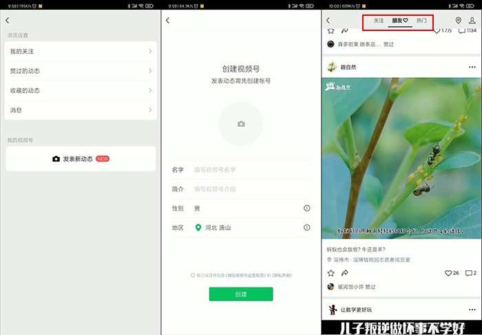 除此之外,视频号本身也做了一部分优化,比方说上方增加了“关注“、”朋友“两个栏目。每个视频下方还有”关注“、”分享“、”点赞“等功能。尽管依旧带着浓浓的微信味,但已经和其他平台很接近了。