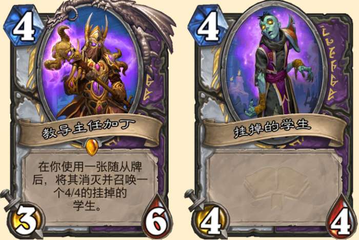 效果是:在你使用一张随从牌后,将其消灭并召唤一个4/4的挂掉的学生。