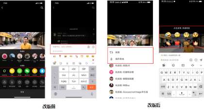 再看转发功能,改版前转发有两种方式,第一是点击右侧的分享图标,再选择转发;第二是在评论的过程中,勾选“评论并转发”的选项进行转发。而改版后,长按视频界面即可出现转发按钮,点击转发后,弹出评论页面,支持一键Emoji并转发。