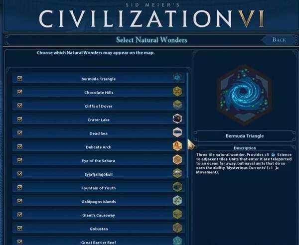 你是否厌倦了百慕大三角区?也看腻了精致拱门?高级设置中加入了全新菜单,可以在其中选择下场游戏将包含的自然奇观。但选中的奇观并不一定会出现在下场游戏中,它们只是进入池中,供游戏随机选择和放置。